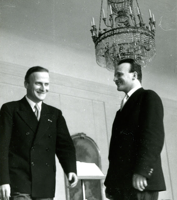 Die Fotos zeigen Yehudi Menuhin - * 22. April 1916 in New York City † 12. März 1999 in Berlin - zusammen mit Karl Richter bei der Ansbacher Bachwoche 1956.